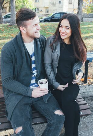 Beautiful and stylish guy and girl are having fun in the park. smiling and having fun