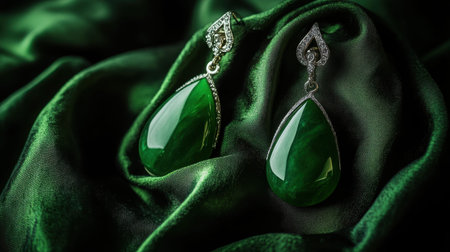 Beautifully crafted green jade earrings featuring silver accents, set against a rich green fabric background, showcasing elegance and luxury in design.