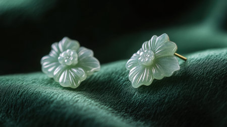 Beautifully carved flower-shaped jewelry pieces resting on rich green fabric. Perfect for fashion accessories, gifts, or elegant decorations.
