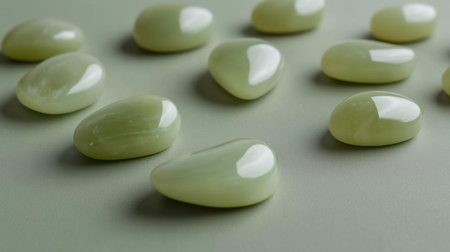 Polished jade stones on a white background, soft shadows, clean copy space