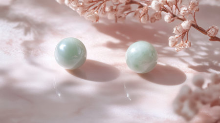 Two elegant jade spheres rest softly on a pastel background, surrounded by delicate pink flowers, embodying tranquility and minimalistic beauty.