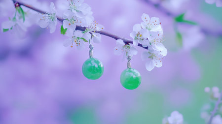 A beautiful close-up of elegant green earrings suspended from a branch of delicate white blossoms, set against a dreamy purple background, capturing nature's beauty.
