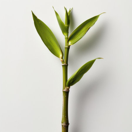 Explore the beauty of a single bamboo stem with fresh leaves. This image symbolizes growth and tranquility, ideal for wellness and nature-related projects.