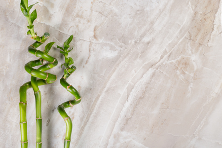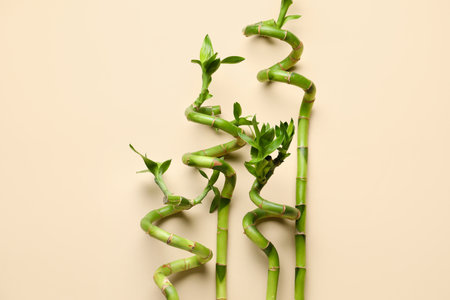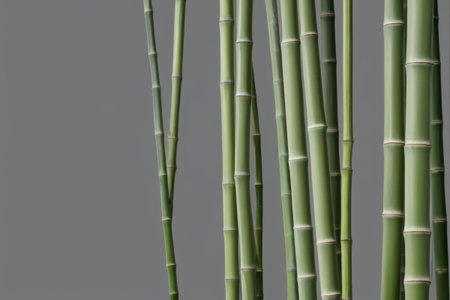 Group of thin green bamboo sticks and leafy shoots arranged vertically on a neutral background