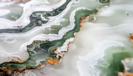Close-up reveals intricate layers of translucent green onyx stone. Golden veins meander across the surface, creating a captivating abstract pattern, highlighted by soft light.