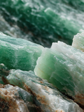 A close-up striking of emerald-hued mineral formations revealing intricate translucent layers and organic fractures, perfect for exploration and collection.