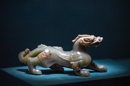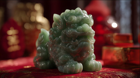 A detailed jade carving of a mythical lion-like creature highlights the meticulous artistry involved. The sculpture stands out with its vibrant green hues, displaying fine textures and expressions.