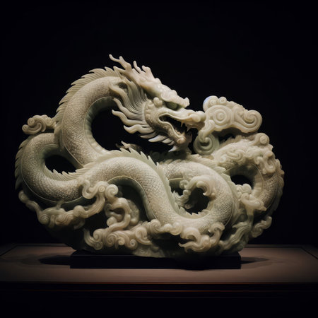 intricate dragon jade carving on black background, created with generative ai