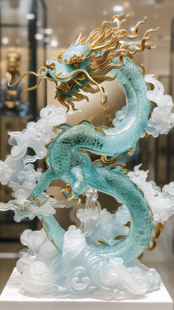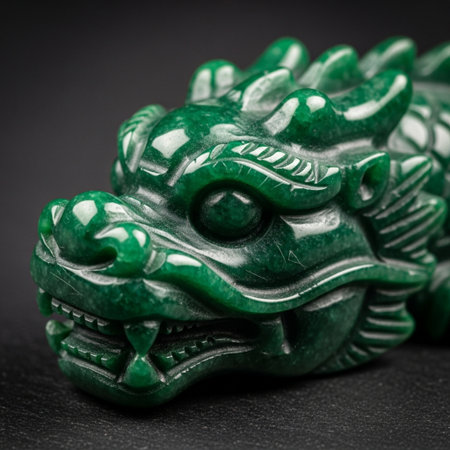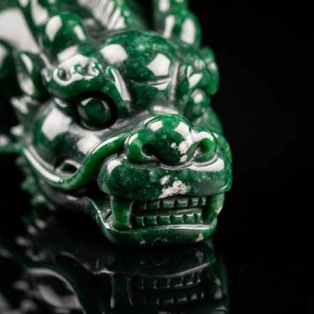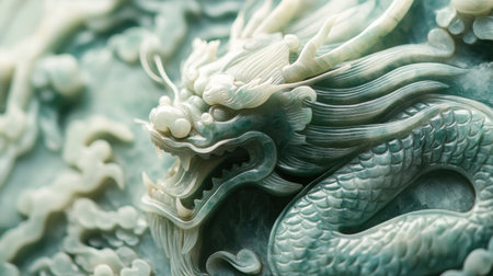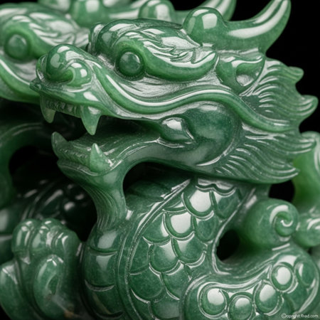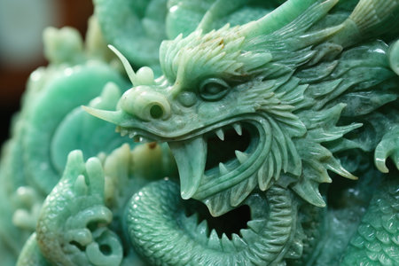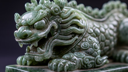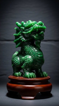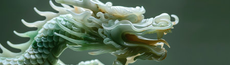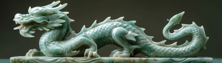 Jade dragon statue against a green backdrop, detailed craftsmanship