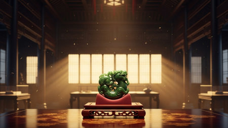 A cinematic wide shot (16:9) capturing an emerald green jade carving (stylized dragon) placed centra
