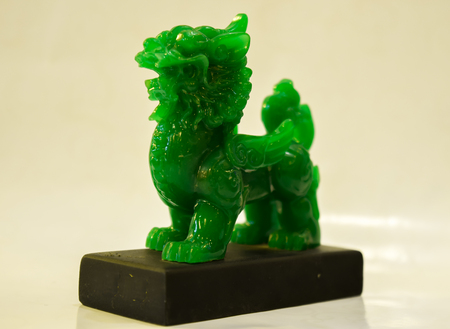 Green jade lion sculpture with intricate carvings on gray stone surface