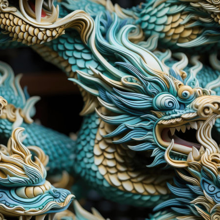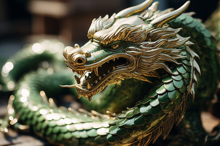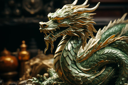 Dragon statue in chinese temple, closeup of green dragon statue