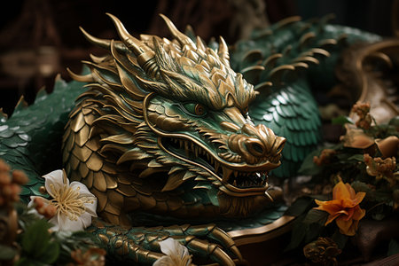 Stunning golden dragon sculpture surrounded by lush flowers on marble. Perfect for adding an artistic and vibrant touch to your interior decor.
