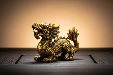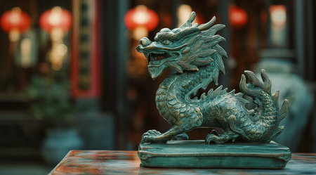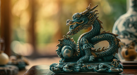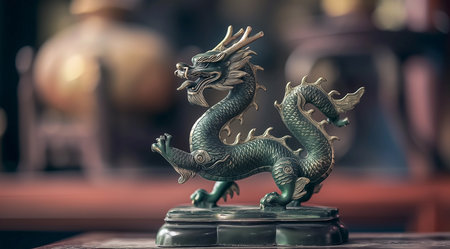 Bronze dragon statue on wooden table with bokeh background.