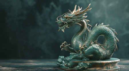 Statue of green dragon on dark background with copy space