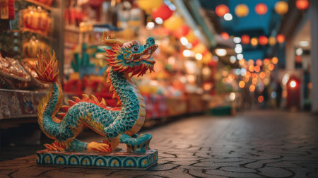 A visually striking dragon sculpture stands proudly on the bustling street, surrounded by colorful market stalls and festive lanterns at dusk.
