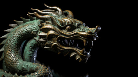 Bronze Chinese dragon statue on dark background. Copy space for text.