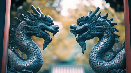 Two intricately carved dragon sculptures captured in soft focus amidst gentle sunlight and bokeh, creating an enchanting and serene atmosphere ideal for art enthusiasts.