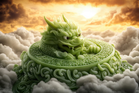 Behold a jade charm, a vibrant green dragon amidst clouds, etched with hope symbols Radiating mystique, it promises good fortune and prosperity Its intricate details and warm-colored sky backdrop, complete with a radiant sun, enhance its majesty A symbol of protection, it beckons all who gaze upon it AI Generative