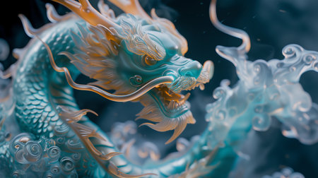Chinese folklore Dragon suitable for Chinese New Year. Decorative colorful background. Translucent glass, turquoise and golden style aesthetics.
