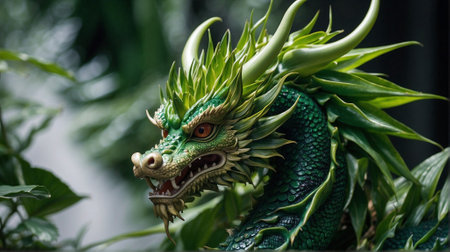 An AI generated illustration of Dragon-like head amidst lush green foliage
