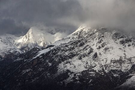 Mountain range under cloudy sky. Snowy peaks of mountains rocks