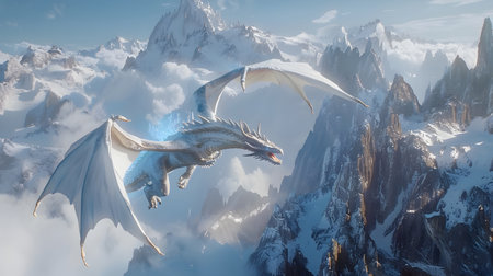 Fantasy dragon mystical glowing detailed with glowing scales flying above a mountain. Perfect for games, book covers, Nand digital art collections.