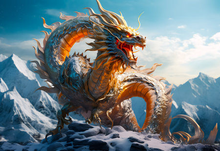 Fantasy dragon stands on the beautiful snowy mountains background.