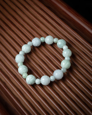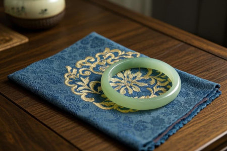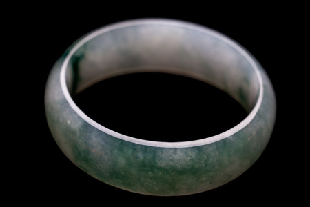 Jade bracelet still life display on blue cloth