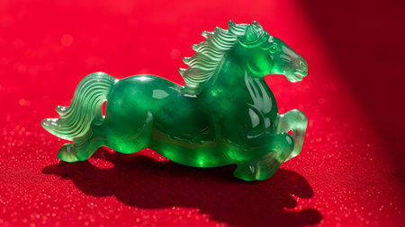 Green translucent jade horse sculpture casting shadow on bright red surface with textured background.