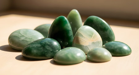 A stunning assortment of polished green stones laid out beautifully on a light background, ideal for themes of tranquility, wellness, and nature-inspired design.