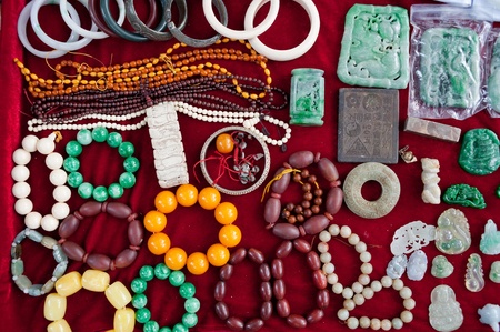 Jade bracelets on display at the Chinatown market in Singapore