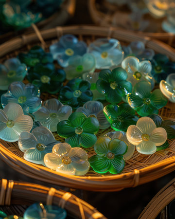 Delightful Thai Pandan Jelly crafted into delicate flower shapes This vibrant, aromatic dessert is perfect for special occasions, offering a stunning presentation with its intricate floral design Each bite is a burst of refreshing, naturally sweet pandan flavor A beautiful and delicious addition to any party or event AI Generative
