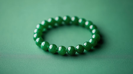 A green bracelet with a bunch of small green beads. The bracelet is sitting on a table. The beads are shiny and the bracelet is round