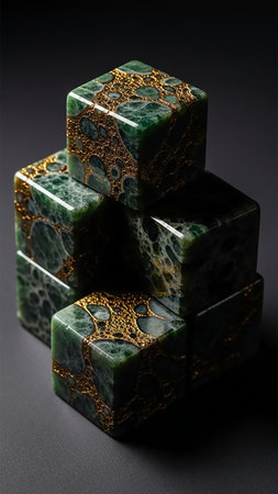 Green showing a stack of five polished green jade cubes with intricate golden veining and texture, artfully arranged on a dark grey surface with dramatic lighting...