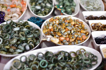 Texture, background, pattern. Folk art. Beads from multi-colored stones and glass