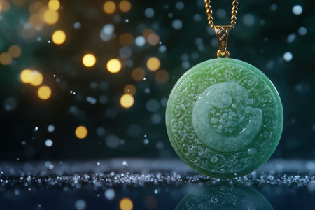 A cinematic environmental wide shot (16:9) featuring an ancient, decorative jade luck pendant placed