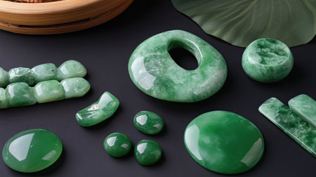 AI Generated. Set of Jade Gemstones in Various Shades of Green on Dark Background
