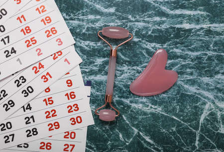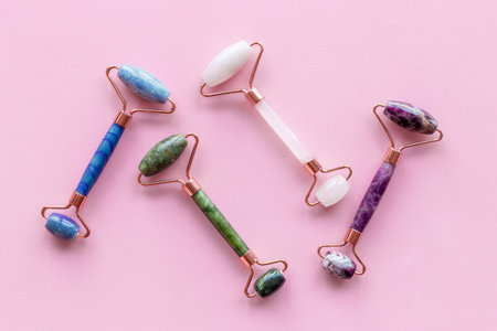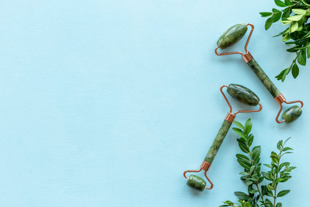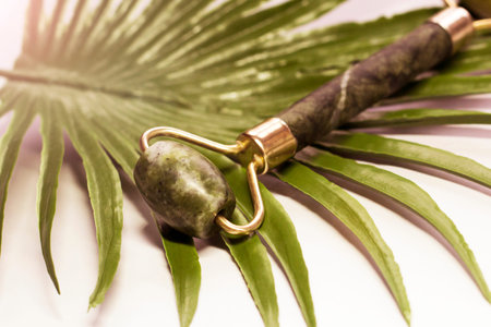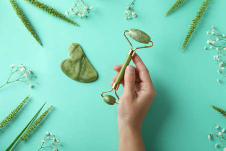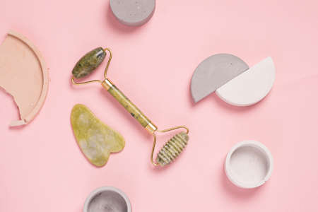 Jade face beauty roller gua Sha massage. Flat lay. Beauty blog advertising. Chinese Eastern medicine concept.
