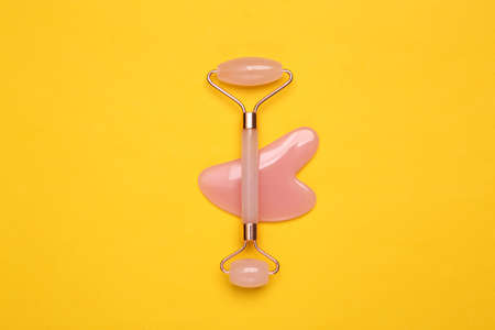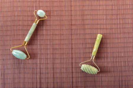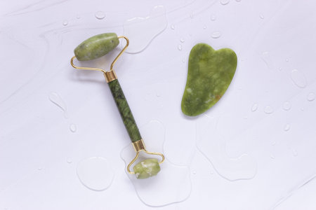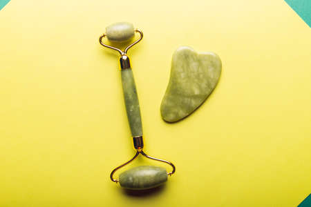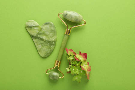 A guasha scraper and a green jade stone roller. Self-care, anti-aging facial massage, spa.