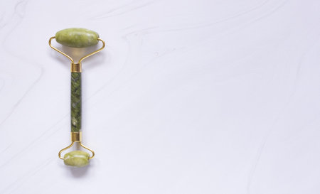 Closeup of jade facial roller and gua sha tool on white marble table background with copy space. Facial massage kit for lifting massage therapy made from natural stones, personal anti-aging tools