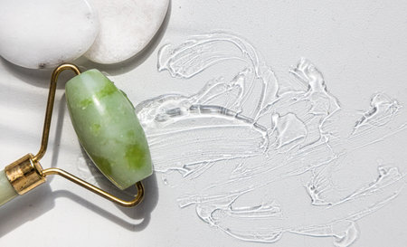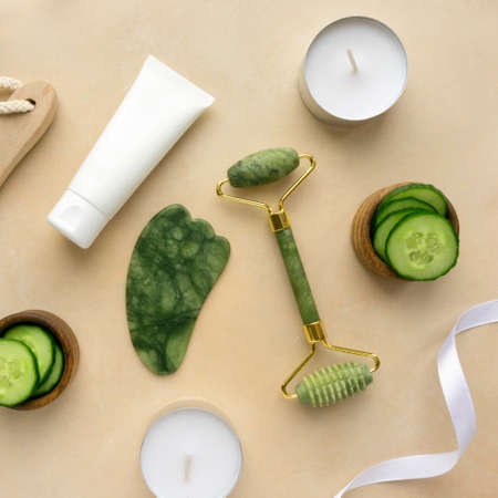 massage stone jade gouache scraper and facial roller with cosmetic cream.