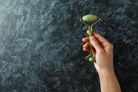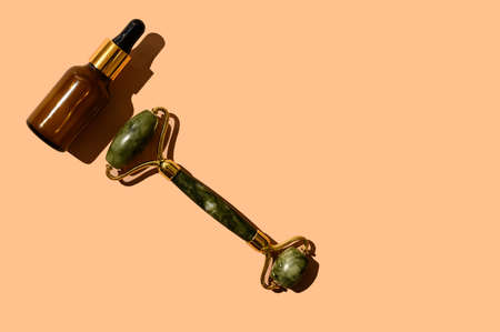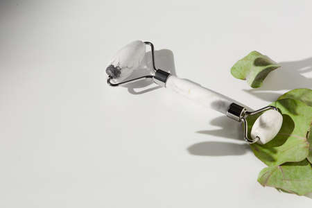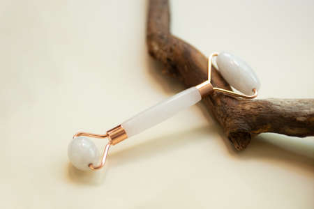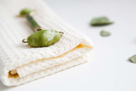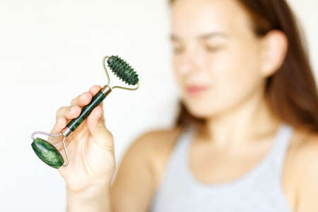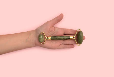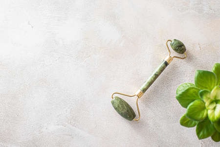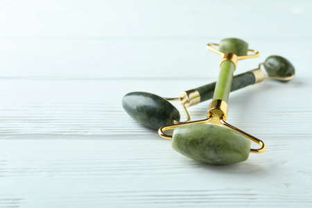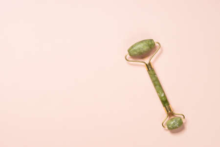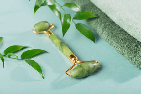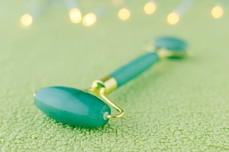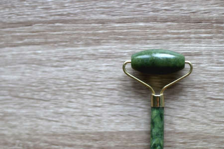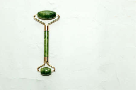 Jade roller for face massage. Facial massage Chinese medicine. Facial massage and beauty concept. Place for text.