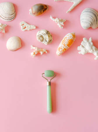 Green face jade roller and white seashells with corals on pink background. Flat lay style. Self care beauty concept.