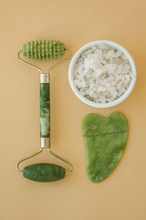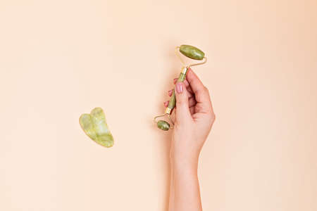 Jade roller and gua sha scraper for facial massage on beige background, top view