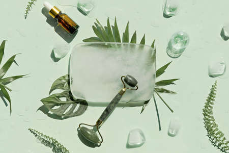 Jade stone face roller, essential oil and handmade cream with ice cubes and exotic palm fern leaves on mint green background.
