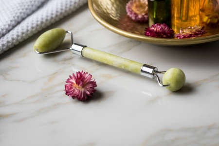 Jade face roller for beauty facial massage therapy, Essential oil bottle. Flat lay on marble table with magnolia flowers. Long shadows and candle.