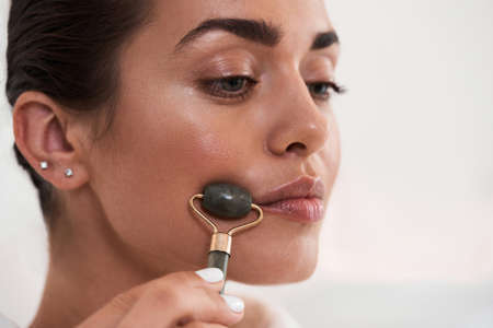 Blurred portrait of adult caucasian woman,using natural jade stone roller to massage face in day at home. Cosmetic and beauty care front view copy space