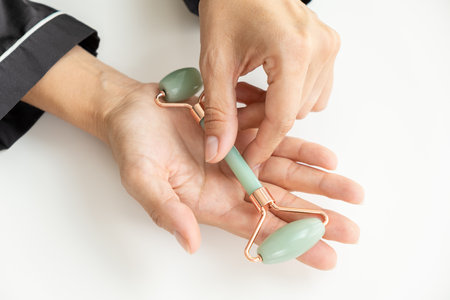 Natural self skin care and trendy anti-aging concept. Cropped view of young african american woman using jade stone facial roller.