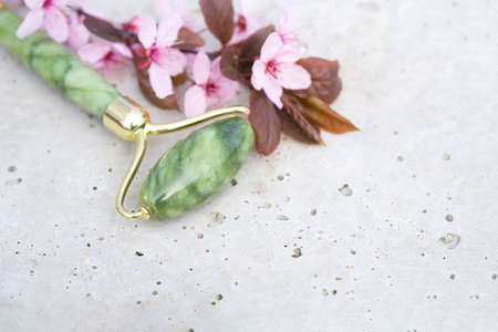 Facial massage kit - jade gua sha face roller on stone concrete background with blooming sakura branch and copy space. Natural stone face massager, skin care concept